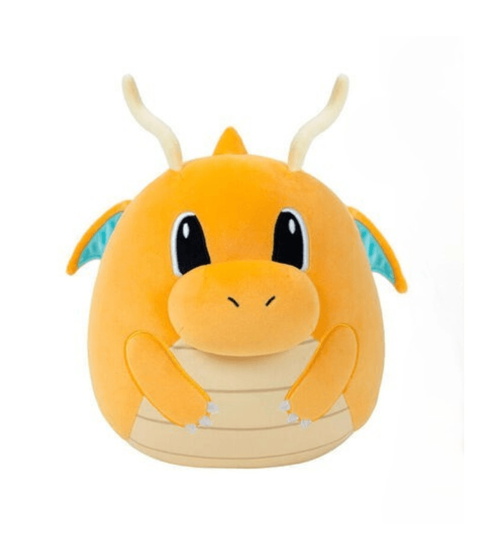 Peluche Squishmallow de Dragonite, el popular Pokémon de tipo Dragón/Volador.