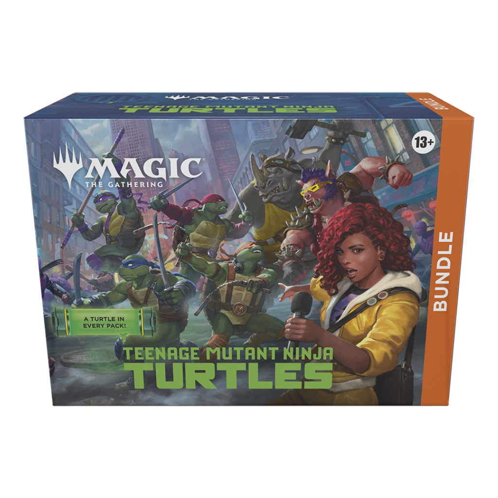 Este bundle contiene 9 sobres de juego de Magic: The Gathering | Teenage Mutant Ninja Turtles. Además, incluye 1 carta foil tradicional con arte alternativo exclusivo del bundle, 15 cartas de tierra foil tradicionales (5 con arte completo) y 15 cartas de tierra no foil (5 con arte completo), 1 contador de vidas Spindown sobredimensionado, 1 caja guardacartas y 2 tarjetas de referencia. Cada sobre de juego contiene 14 cartas de Magic: The Gathering, incluidas entre 1 y 5 cartas raras o de una rareza superior y al menos 1 carta foil tradicional.